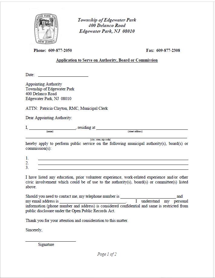 Do you want to serve Edgewater Park on a Board, Commission or Committee in 2026? Fill out the Citizen Leadership form (below) and submit by Dec. 1, 2025, to be considered for appointment by the Township Committee.
