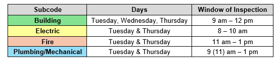 - Inspections: Handled by Building & Electrical, only. Can by accommodated on the same day.