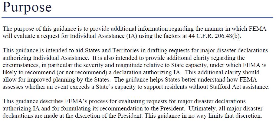 FEMA Individual Assistance Declarations Factors Guidance - June 2019 to help residents with recent flooding issues