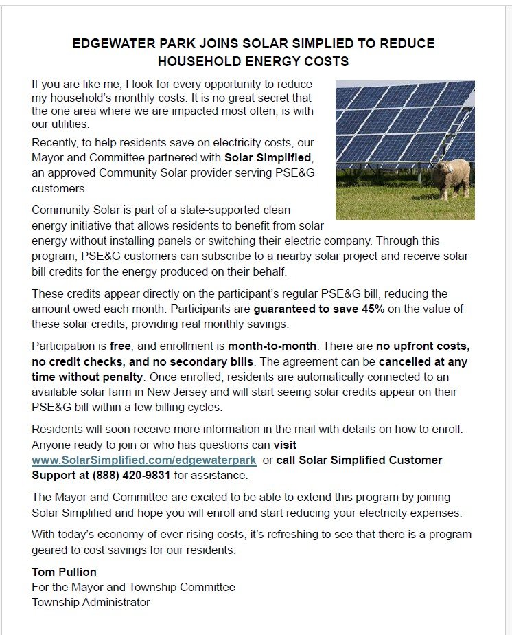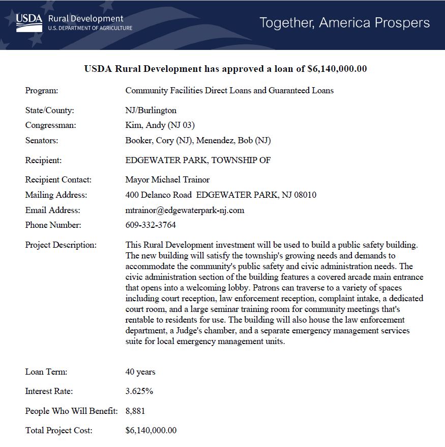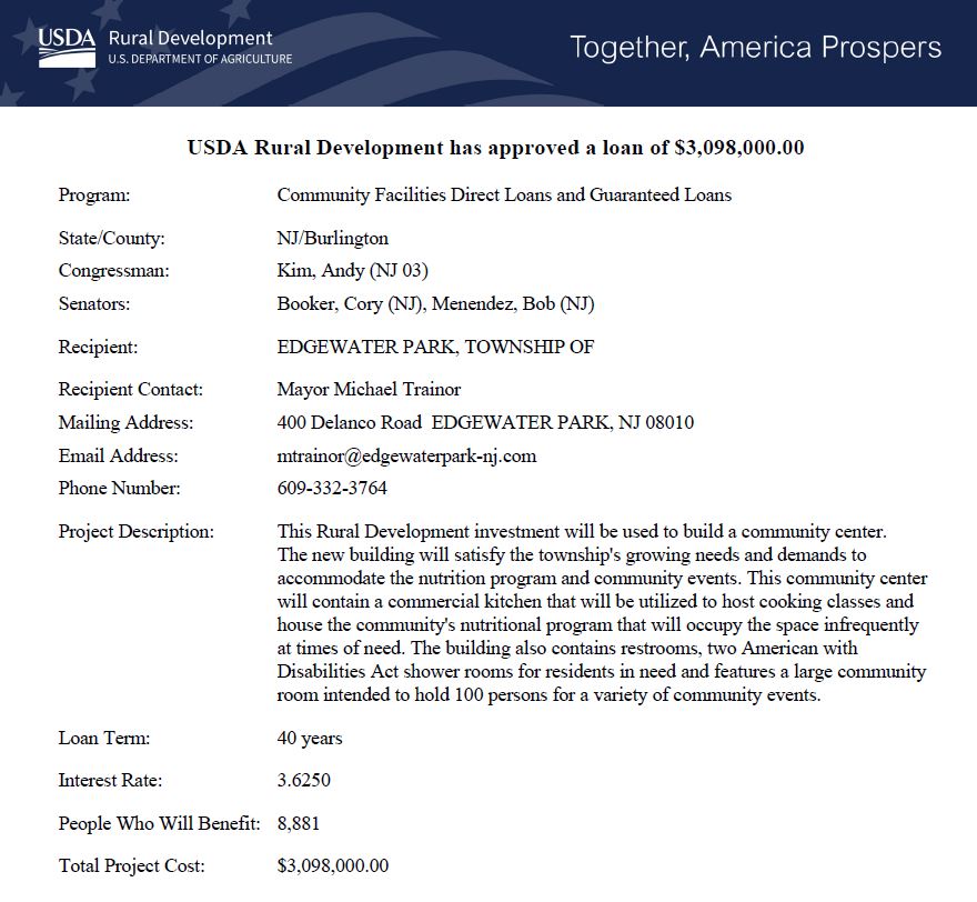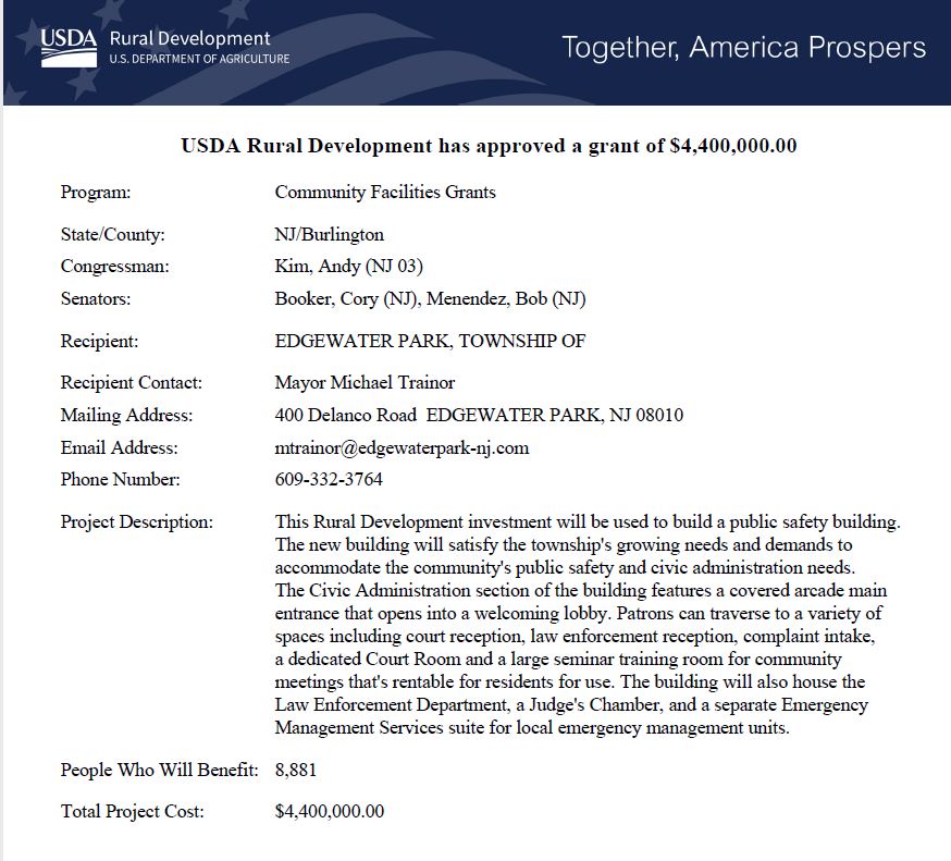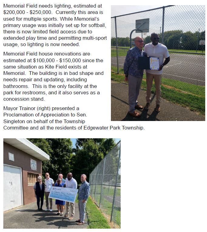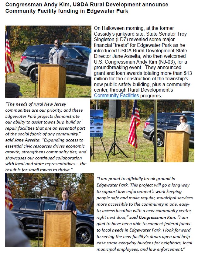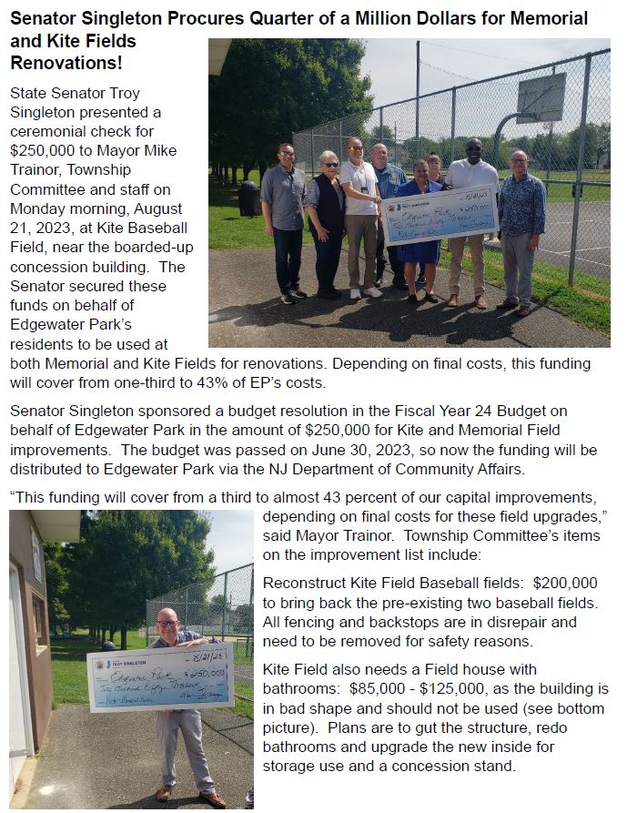 On February 15, 2022, Edgewater Park Township received from both from the Office of Senator Troy Singleton and the Murphy Administration the following good news:
