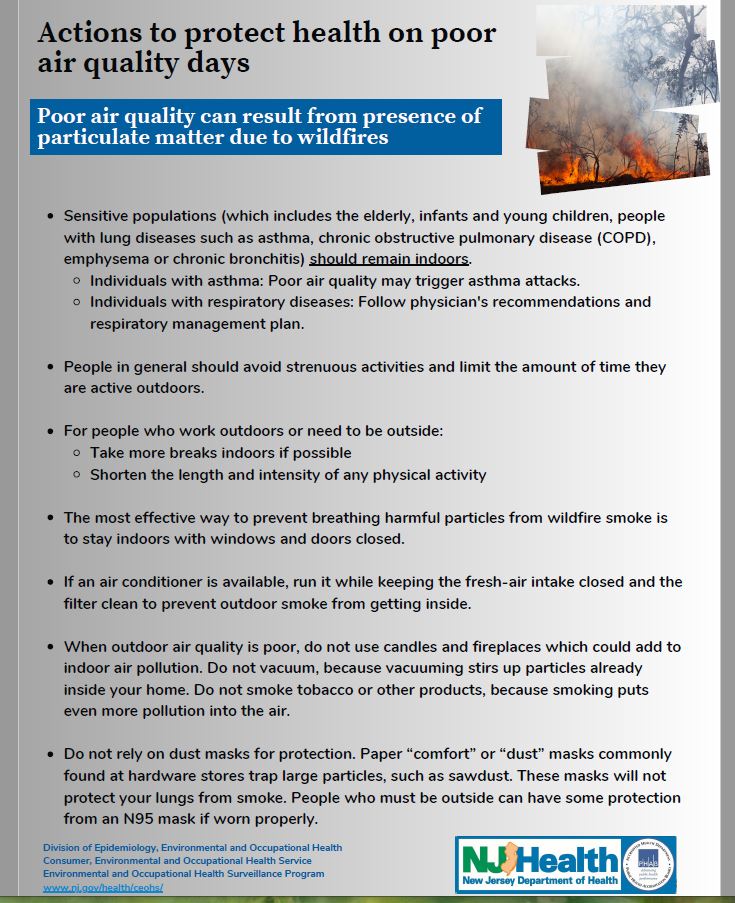 Here is NJ Department of Health guidance for poor air quality days. Click to download the pdf file.