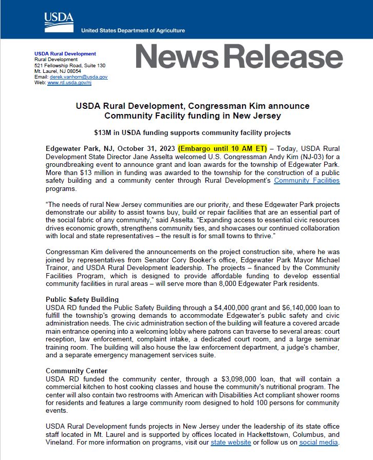 Congressman Kim leads procurement success for funding EP Public Safety Building and Community Center