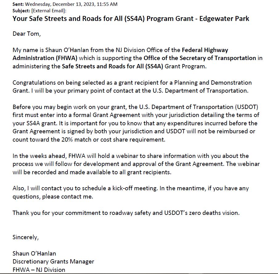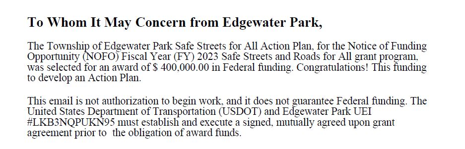 Edgewater Park Selected as Recipient for "Safe Streets & Roads for All" (SS4A) Planning and Demonstration Grant!