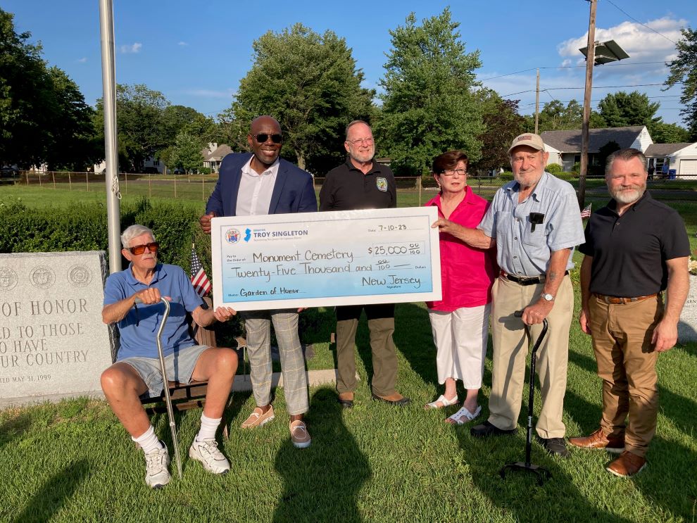 Standing at the Veterans Garden Honor section of Monument Cemetery, L-R: Bill Lucas, Cemetery Trustee, State Senator Troy Singleton, Kevin Johnson, Edgewater Park Committeeman, Judy Hall & Ralph Ulissi, Cemetery Trustees, and George Stevenson, Trustee President
