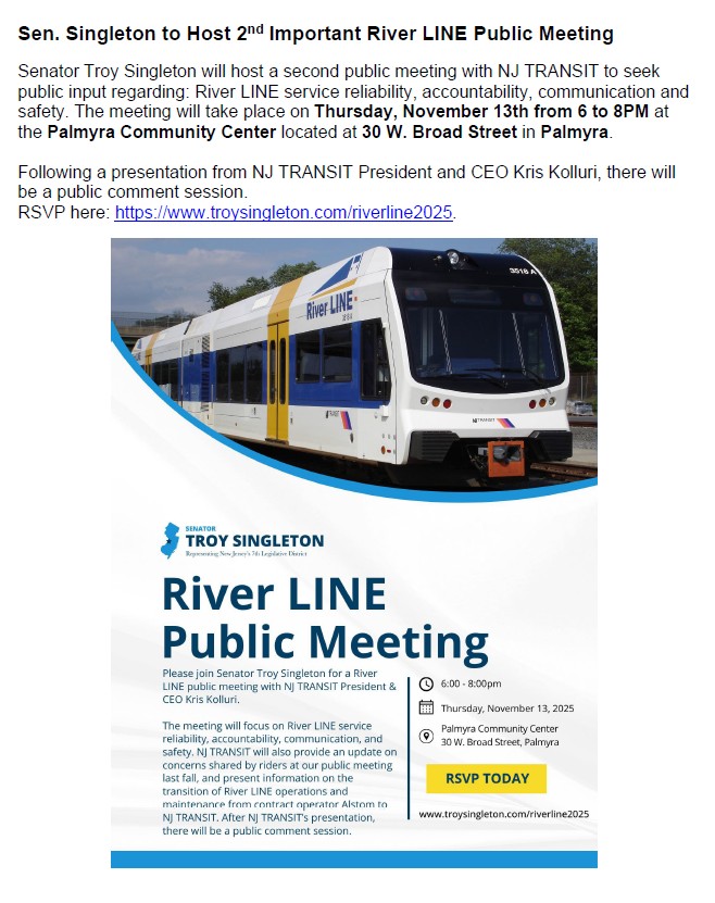 Sen. Troy Singleton to Host 2nd NJ Transit RiverLINE Public Meeting, Nov. 13th