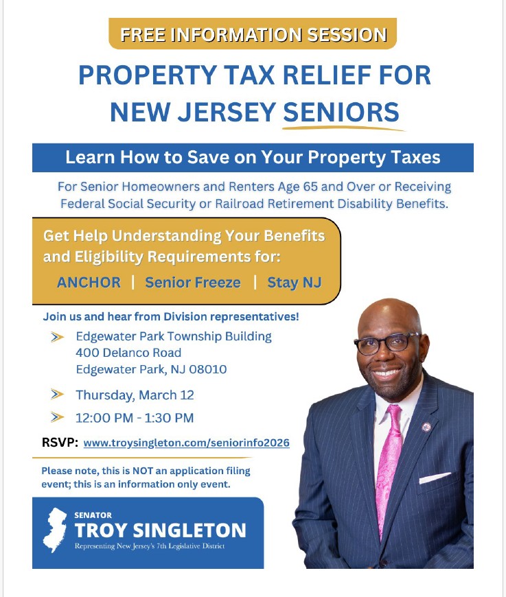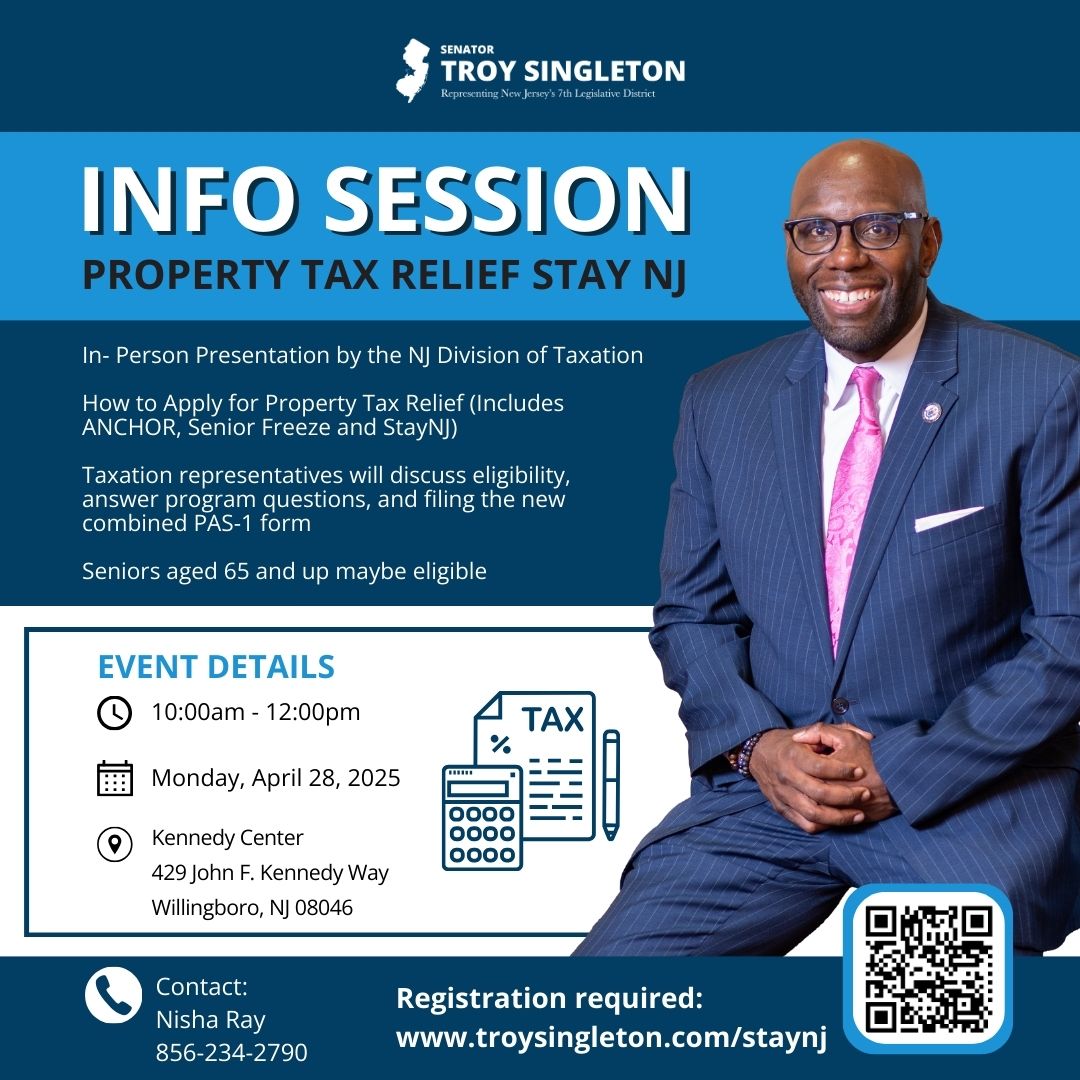 Senator Troy Singleton, Assemblywoman Carol Murphy, and Assemblyman Balvir Singh are hosting Property Tax Relief Information Sessions this summer & early fall, in partnership with the NJ Division of Taxation. The NJ Division of Taxation will be on hand and their presentation will discuss how to apply for property tax relief - ANCHOR Senior Freeze, and StayNJ - as well as how to file the new combined application Blue Book, and eligibility requirements.
